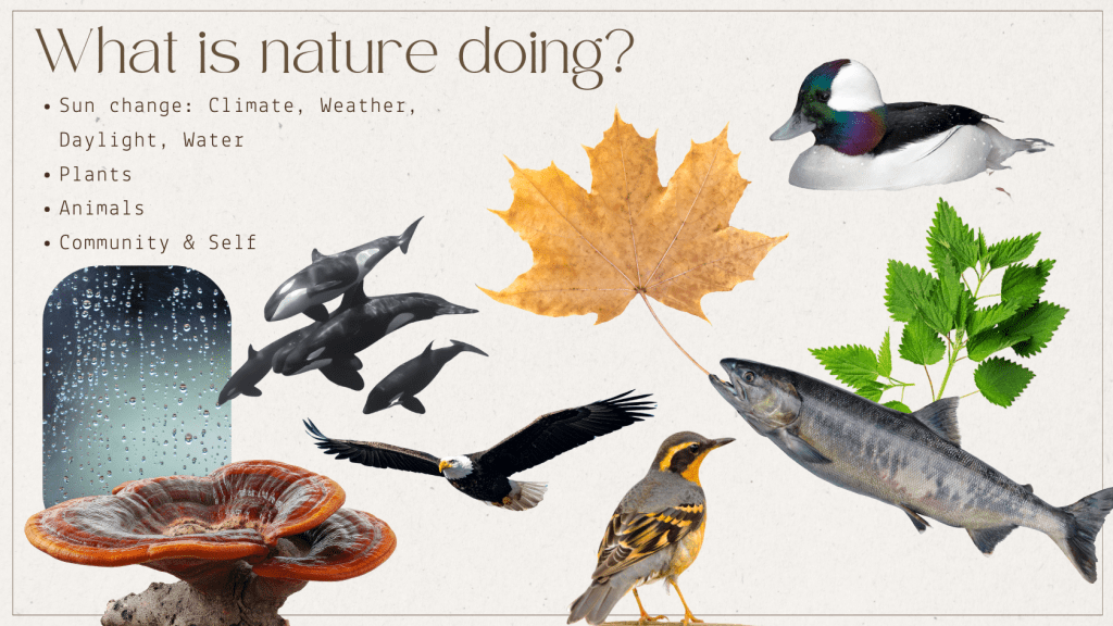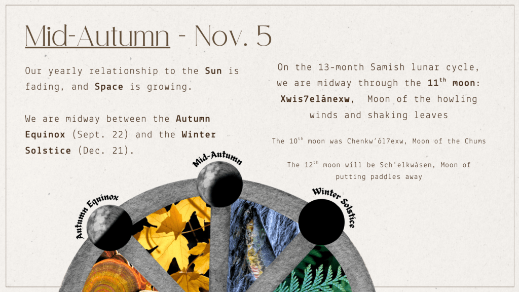 So, what did we see? For me, Mid-Autumn is the time that dog salmon return to Carkeek; the weird arctic ducks come back to Bitter Lake for winter residence; and the rains begin. This year I also realized this marker coincides with the highest peak of leaf fall. By the Winter Solstice all the trees will be bare. What with the leaves and the sudden rain, this time feels grey, muddy, and messy.