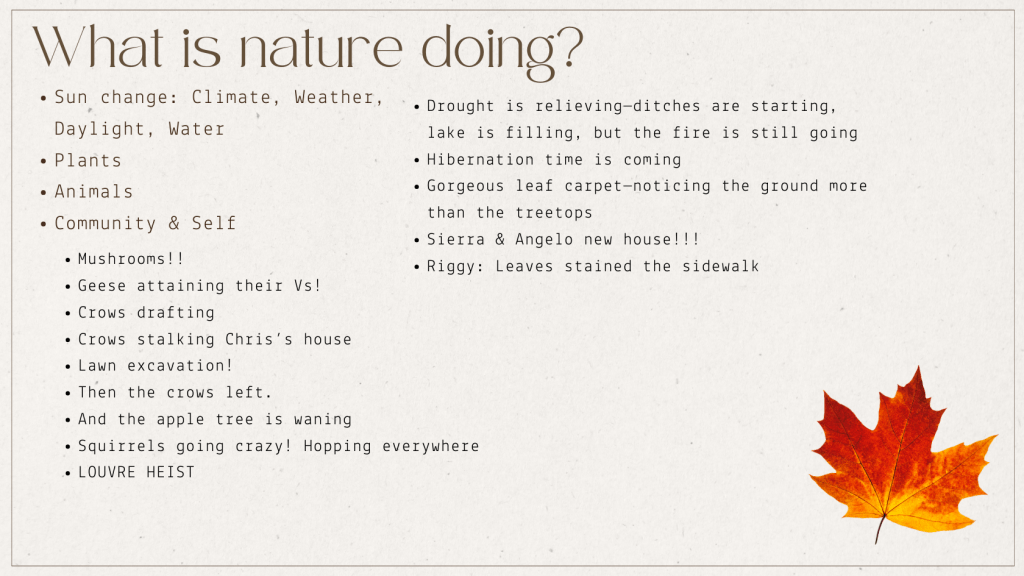 Others noticed changes in attention. Sarah realized her sight has dropped lower down, as the beauty of leaves suddenly falls to the ground. A few people noticed water is rising everywhere, though we are still in drought. We are responding to the growing darkness like the squirrels—maybe it will bring mania, maybe it will bring hibernation, either way there’s some dread about it. Either way, life goes on. Sierra and Angelo are moving into a new house to fit their family, both a cause for celebration and a daunting pile of work. My favorite observation of the whole night was Amerigo noticing the way that leaves in this season stain the sidewalk, like a temporary art project from the trees.